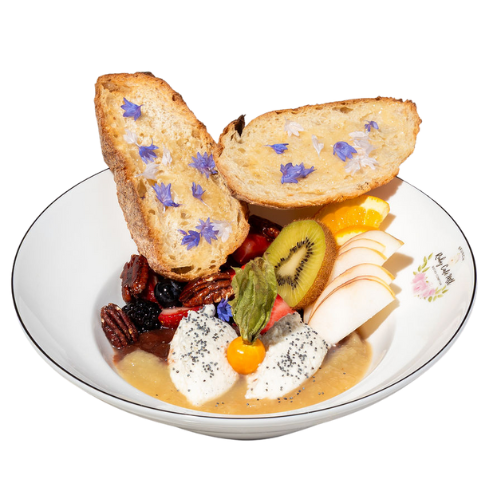 Country bread, plum and apple compote with 5 spices, vanilla and Maple Ricotta, Anicet’s honey with star anise, berries, blueberry flowers