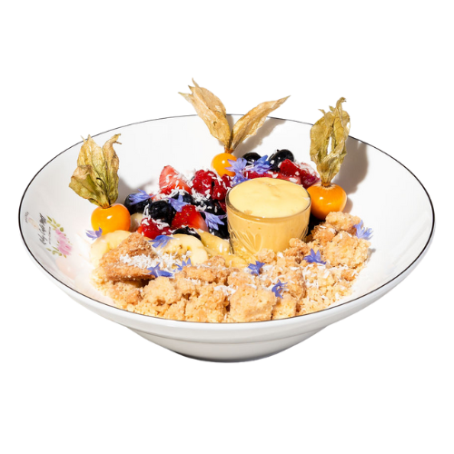 Coconut Yogurt, Bananas with Maple Syrup, Crumble, Blond Raisin, Coconut Shell, Small Fruit, Blueberry Flower, Mango And Lime Smoothie Shooter