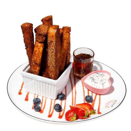 fried panko french toast stick, -Lime yogurt, maple syrup, small fruit, ice sugar
