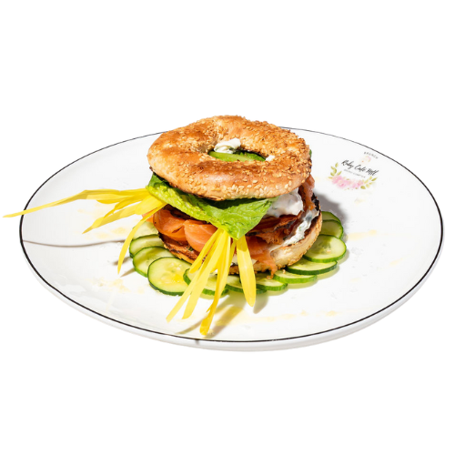 St-viateur bagel, smoked salmon from the buccaneer, philly with chives, tzatziki sauce, pancetta chips, romaine heart, yellow pop