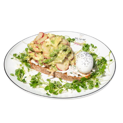 Avocado, red onion, baby arugula salad, country bread, rosemary marinated feta cheese, poached egg, radish sour cream, poppy seeds, arugula pods