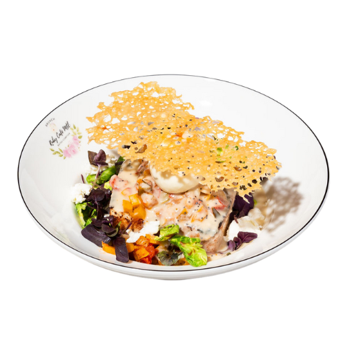 Sliced yellow beet, pesto, goat cheese, crushed pistachio, baby spinach, sour sauce, beet sprouts