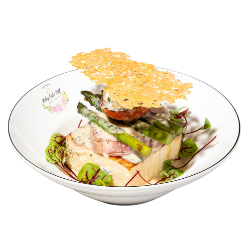 Brioche bread, white ham from Gaspor, candied tomato, asparagus, strong cheddar crunch, poached duck egg, white wine and fresh tarragon soup, poppy seeds, sorrel pods