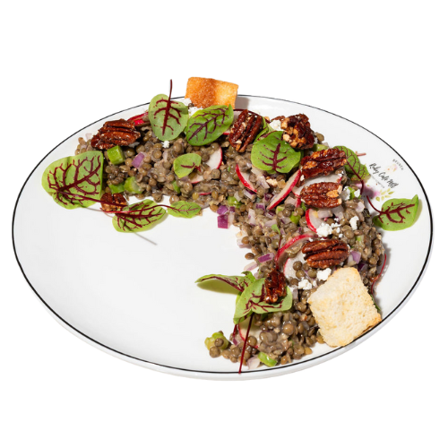 wo color lentils, red onion, ciboulette, sherry vinaigrette, pecan, asparagus, country bread, Fresh Ricotta cheese