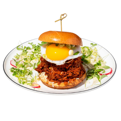 brioche bun burger, pulled pork from Gaspor, chorizo, homemade barbecue sauce, strong cheddar cheese, mirrored goose egg, green onion, jalapeño sour cream, cilantro sprouts.